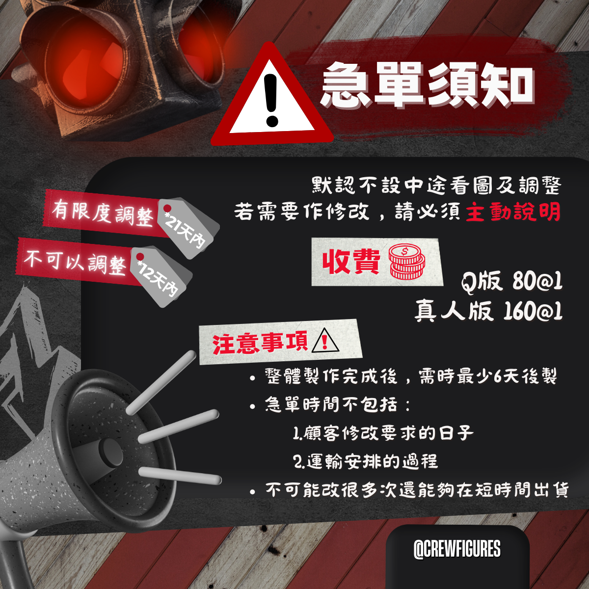 急單目的是為了追趕時間,純手工作品調整需花上額外修改時間。顧客必需於品質及時間上取平衡、不作多番修改以趕上指定日期完成,Crew Figures並不會為客戶修改要求而延遲收貨的後果負上任何責任!